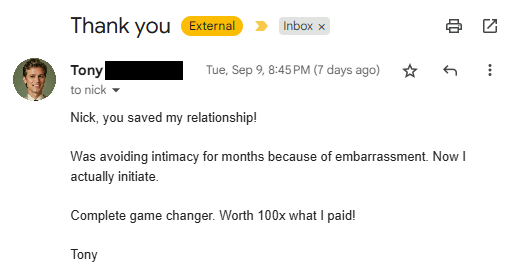 "Honestly I was skeptical but I figured it was worth a shot. Lasting 15+ minutes after one week and I’ve never felt more confident in my life!"